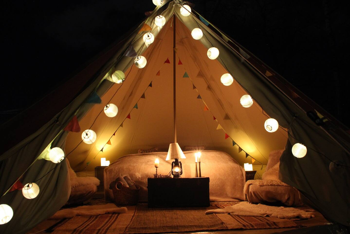 这个词虽然存在的年代不长,但这种形式的首次出现可以追溯到16世纪:苏格兰的一位伯爵为来访的国王詹姆斯五世和他的母亲准备了一次奢华的户外体验。伯爵搭起了豪华的帐篷,在里面摆满了自己家的奢华物品,让母子住得如室内般舒适的同时又充满野趣。