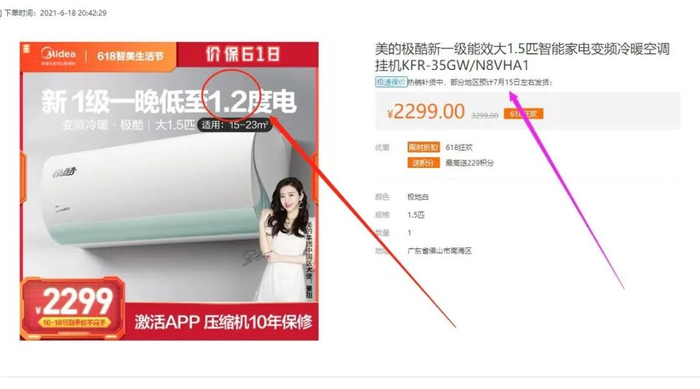 近日,来自广东佛山的消费者冯女士向《消费者报道》反映,她618当天在美的官方商城小程序花费6297元购买了3台1.5匹空调,让她诧异的是,几天后却意外发现产品购买页面的宣传文案由原来的“一晚低至1.2度电”变成了“一晚低至1.8度电”。在询问客服后被告知,1匹是1.2度电,1.5匹是1.8度电。