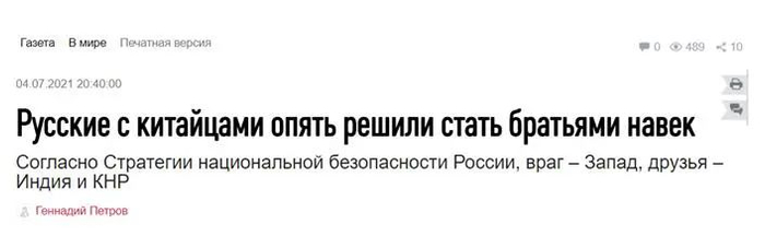 俄罗斯法律信息网站3日公布了经俄罗斯总统普京批准的新版《俄罗斯联邦国家安全战略》(以下简称“新版战略”),俄罗斯《独立报》当地时间4日发表题为《俄罗斯人和中国人决定做“永远的兄弟”》的文章称,俄新版战略将中国和印度视为合作伙伴,将在不结盟的基础上与中印在亚太地区建立地区稳定机制。此外,这篇文章还在副标题部分直接写道:根据俄国家安全战略,(俄罗斯的)敌人是西方,朋友是中国和印度。