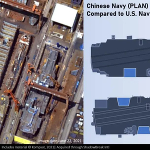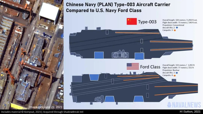 报道称,商业卫星照片显示,中国003型航母长约320米,只比“福特”号短了 13 米。不过003型航母的飞行甲板更窄,宽度约为 73 米(“福特”号为78米)。“这与中国海军现有的辽宁舰和山东舰航母非常相似”。报道认为,这可能受限于后勤因素,因为它们需要进入同样尺寸的干船坞进行维修。