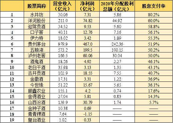 与之类似,2020年伊力特实现营业收入18.02亿元,同比下降21.71%;净利润3.42亿元,同比下降23.48%,但伊力特仍向全体股东每10股派4.05元(含税),分配利润总额1.89亿元,股息支付率为55.3%。