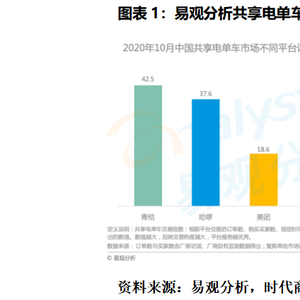 根据易观分析发布的《2020中国共享两轮车市场专题报告》,截至2020年10月,中国共享电单车市场不同平台订单交易指数显示,青桔、哈啰和美团分别以42.5、37.6和18.6的交易指数分别位列前三,其他品牌交易指数仅1.3(共享电单车交易指数是根据平台交易的订单数、购买买家数、指定时间内的复购率等综合计算所得)。