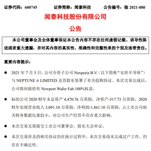 7月5日晚间,闻泰科技发布公告,宣布旗下全资子公司安世半导体(Nexperia B.V.)已与英国最大的芯片制造商Newport Wafer Fab母公司NEPTUNE 6 LIMITED(以下简称“NEPTUNE 6”)及其股东签署了有关收购协议。