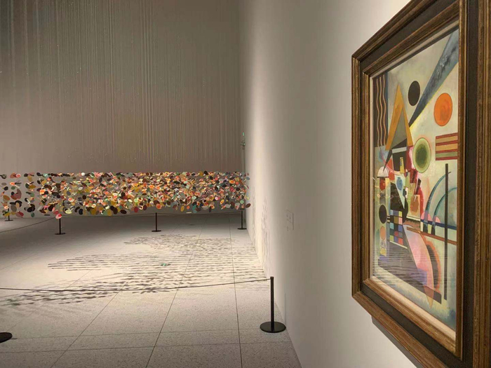 康定斯基的《摇摆》(1925)与佩·怀特的《悬垂断章》(2004),作为颜色创造的光与运动印象的主题,在同一展厅中陈列。