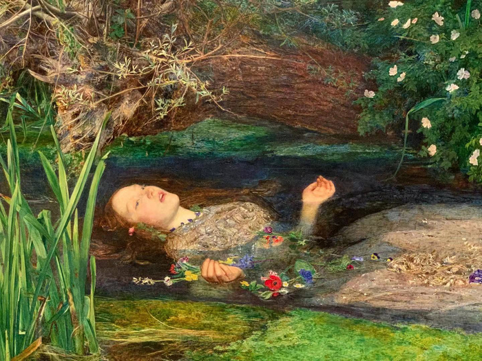 面对《奥菲莉娅》,观众似乎被吸收到她身处的风景中,在摄影刚刚诞生的时代,米莱以画笔完成了超越照片的记录,让人看到了画家比摄影师更有想象力和情感上的优势。《奥菲莉娅》的风景部分写生于英格兰东南部的霍格米尔河畔,画中的模特是19岁的伊丽莎白·西达尔,她后来嫁给了同为“拉斐尔前派”的画家但丁·加布里埃尔·罗塞蒂,而画该画时,米莱仅仅22岁。