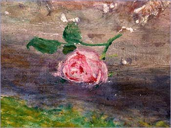 《奥菲莉娅》(局部),浮在奥菲莉娅脸颊和裙子上的粉红玫瑰和生长在河岸上的白色田野玫瑰,可能是指向雷欧提斯称其妹妹为“五月的玫瑰”。它们也有许多象征意义,如青春、爱情和美丽。