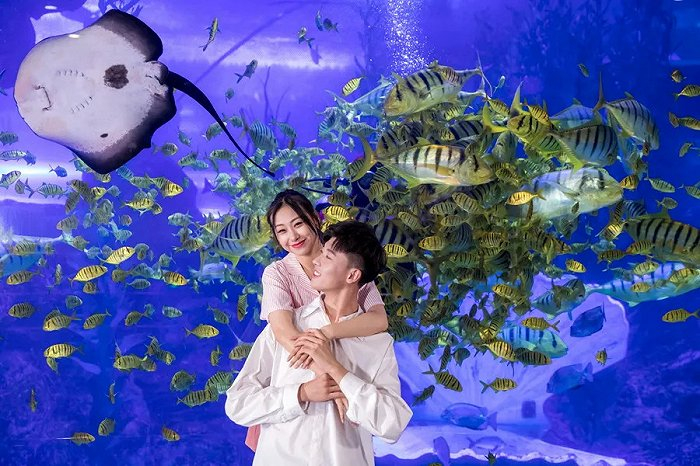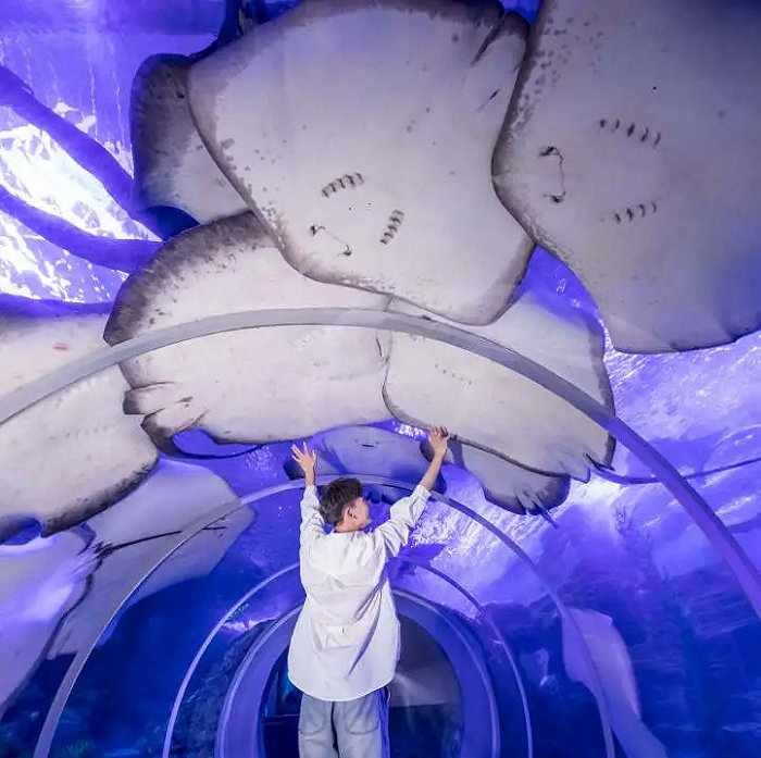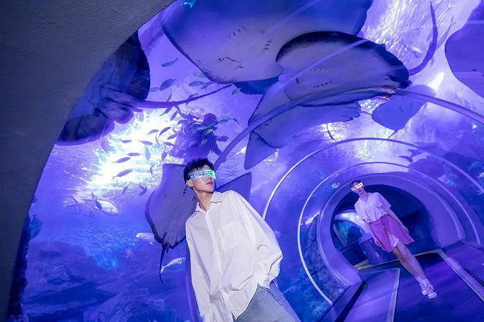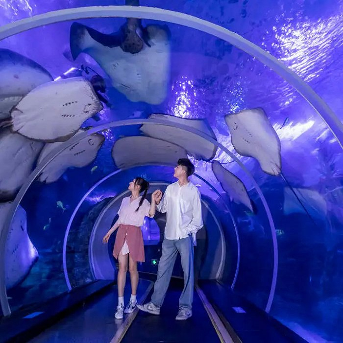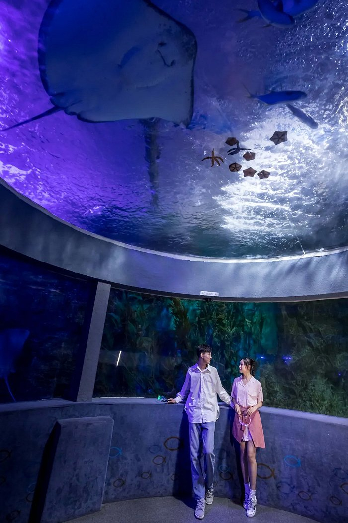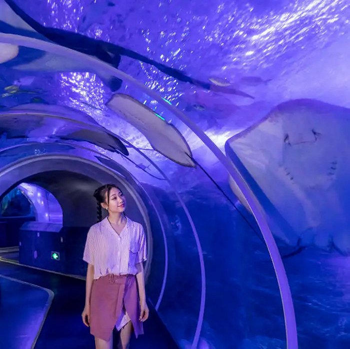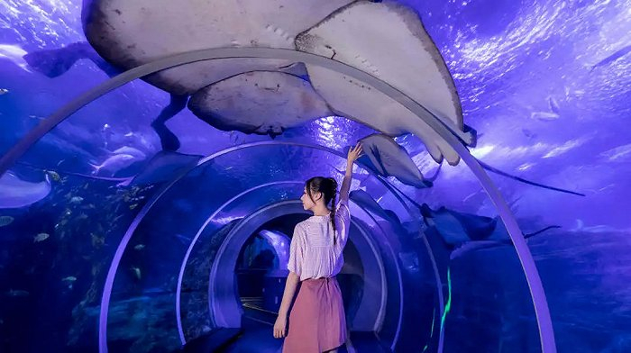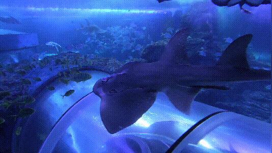 在近百米长的海底隧道中悠悠散步,身侧有各类海洋鱼类并肩漫游,有光透过微微荡漾的水面投下斑驳光影……