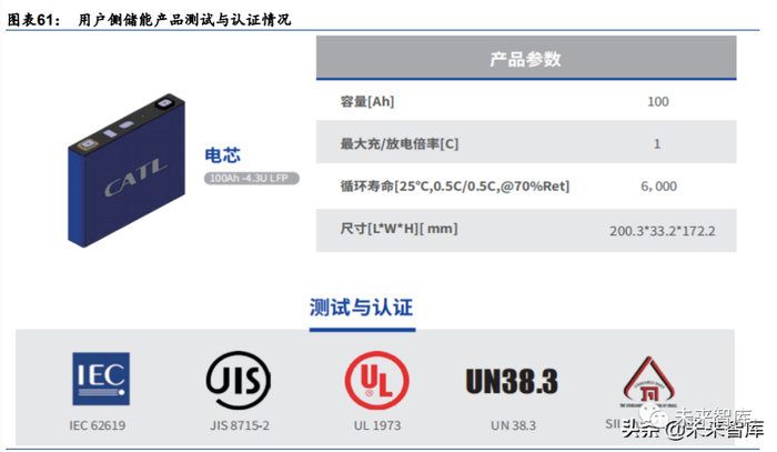 安全与政策标准有望完善,带动行业集中度提升。当前电化学储能系统仍处于发展初期, 产品以及施工标准尚未完善,配储考核政策仍有待推出。此外,辅助服务市场已有针对储能响应时间和调节效果 考核,我们认为后续发电侧配储的实际运营效果监督仍将提升,进一步加速行业规范化进 程。头部厂商在产品安全和认证方面处于领先水平,如宁德时代家用储能方案已通过 IEC62619、UL 1973 等五项测试认知,比亚迪 BYD Cube T28 通过德国莱茵 TÜV UL9540A 热失控测试,我们认为储能行业规范化后行业集中度或提升。