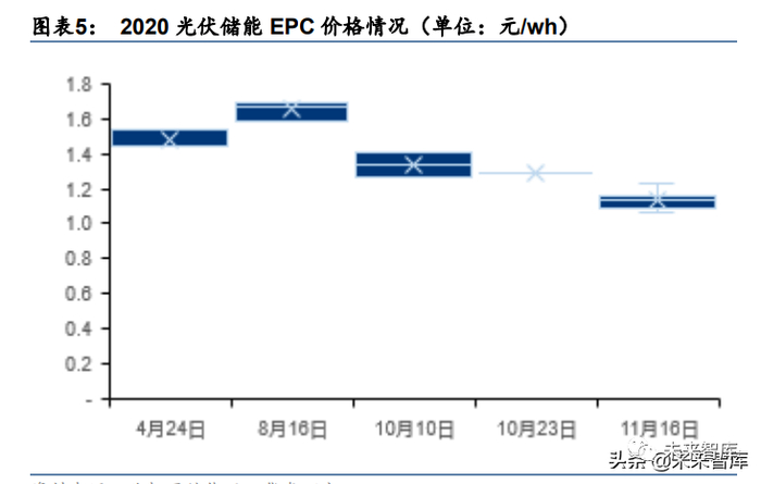 储能 EPC 成本:储能的 EPC 建设成本与产品价格和放电时长均有关,20 年以来公示的储能项目 EPC 价格呈现下降态势,风电配储(1C,充电时间 1 小 时)的最低中标价格已经从 20 年初的 2.154 元/Wh 下降到 1.634 元/Wh,降幅达 24.1%。光伏配储(0.5C,充电时间 2 小时)的最低中标价格从 20 年初的 1.448 元/wh 下降到年底 的 1.06 元/wh(降幅达 26.8%),其中示例项目的风光配储价格不同主要受放电时长和电池 倍率影响。