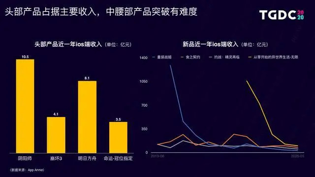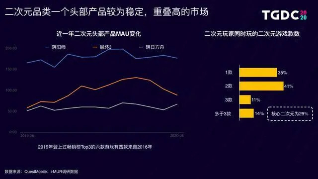 在“可爱又迷人的‘难搞角色’——二次元游戏市场及人群洞察”中,腾讯观察到的数据是“二次元品类是一个头部较为稳定,重叠高的市场,且头部产品占据主要收入,中腰部产品突破困难。”