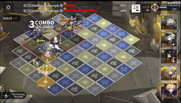 将玩家引入游戏后,《白夜极光》的战旗消消乐玩法也让它打出了玩法上的差异化。游戏基础玩法就是在棋盘上进行同色格子连线攻击,连线格子越多,攻击加成越高,玩法直观,入门友好。基础玩法之上,搭配各个角色技能、“极光时间”设定,又让游戏玩法并不简单,部分需要考虑boss技能范围的地图,玩家需要做的除了打出尽可能高的伤害,还需要进行“走位”,躲掉boss大招。