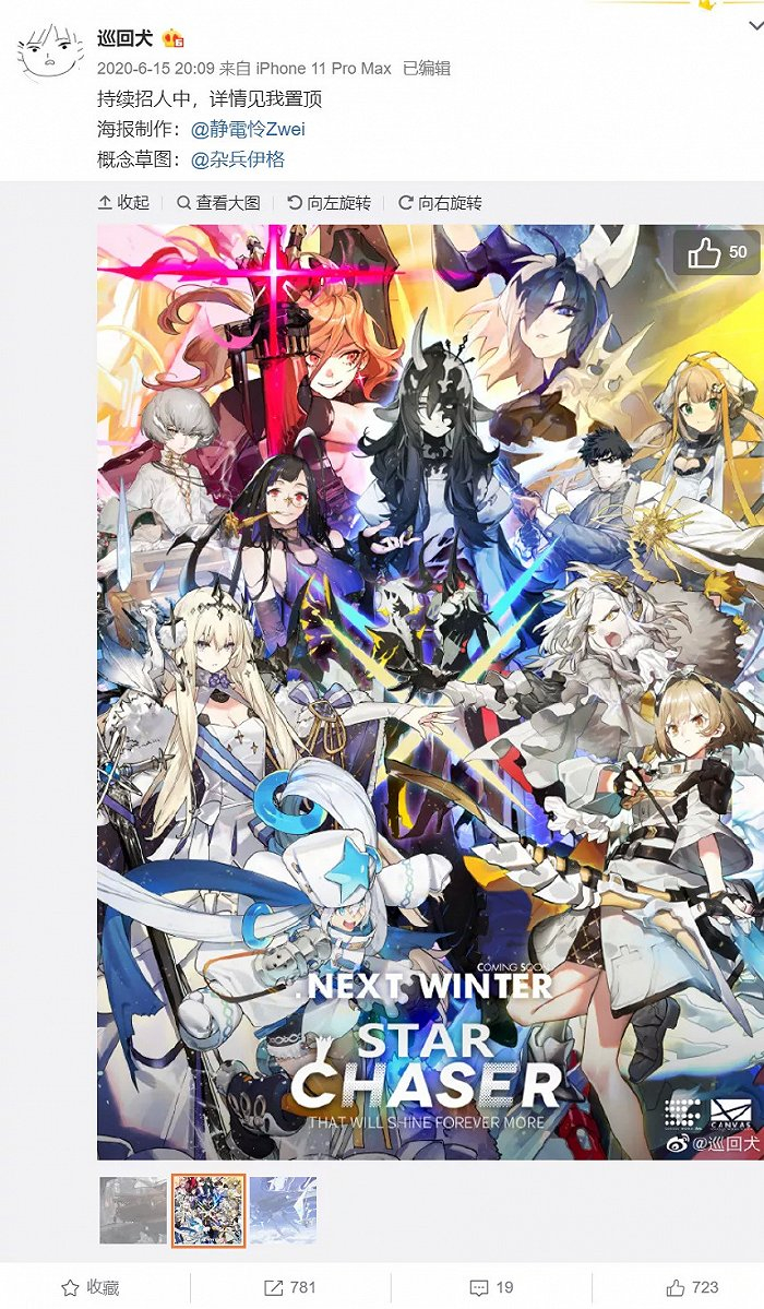 《白夜极光》最开始引起大众关注,源自其高质量的美术。从去年开始,其游戏主美兼制作人巡回犬在微博上陆续曝光的高质量游戏海报、人物立绘、Live2D等,让游戏收获了第一批粉丝。