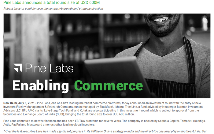 Pine Labs 是一家零售 POS 方案解决商,现阶段着力发展包括电子钱包在内的数字支付方式业务。公司为零售商和中小企业提供的配套服务主要为用户数据分析、交易明细及贷款服务。该公司的合作伙伴包括耐克、麦当劳、肯德基、苹果等大型企业。