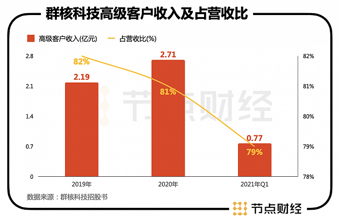 其中,高级客户意为拥有5个注册账户以上的企业客户,关键客户意为收入贡献超过20万的客户。据招股书披露,2019年至2021年一季度,企业客户几乎贡献了所有订阅收入,特别是高级客户,分别贡献2.19亿元,2.71亿元、0.77亿元,分别占总收入的82%,81%、79%。