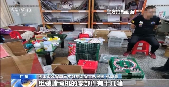 广东佛山市公安局三水分局治安大队民警 张翼高:我们搜到赌博机整机15台,组装赌博机的零部件有十几箱。据他交代,他共销售了大概是365台(赌博机)。