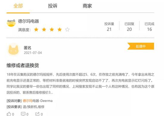此外,在黑猫投诉上,德尔玛的投诉量有21个。内容涉及榨汁机充不了电、电器功率不达标、除螨仪故障无法使用等问题。