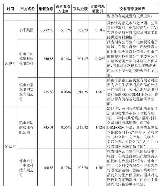 2019年、2020年,德尔玛从小米集团的采购金额分别为568.24 万元、2298.61万元,占采购总额0.58%、1.68%;向小米集团销售金额分别为7772.47万元、2.81亿元,占营收比例为5.12% 、12.61%。可以看出,无论是采购还是销售,从金额到占比都呈现增长趋势。