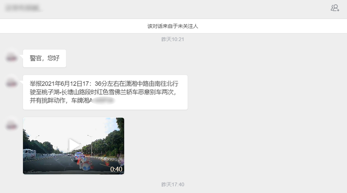 近日,湖南交警在微博后台接到网友私信举报,请求交警严查故意别车行为。