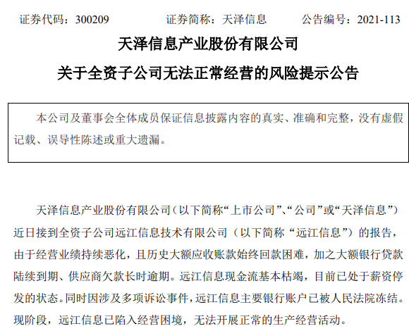 天泽信息同日披露的风险提示公告显示,由于经营业绩持续恶化,且历史大额应收账款始终回款困难,加之大额银行贷款陆续到期、供应商欠款长时逾期,“远江信息现金流基本枯竭,目前已处于薪资停发的状态。同时因涉及多项诉讼事件,远江信息主要银行账户已被人民法院冻结。”公司也不得不承认,“现阶段,远江信息已陷入经营困境,无法开展正常的生产经营活动。”