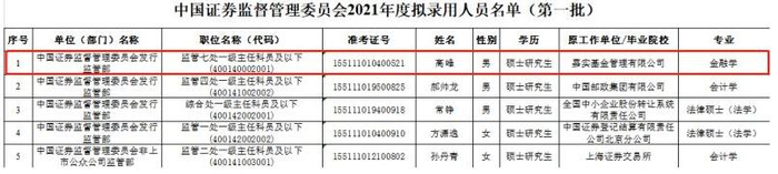 证监会2021年度拟录用名单显示,嘉实基金的一位指数基金经理高峰,被拟录用为证监会发行监管部监管七处一级主任科员及以下的职位,主要从事发行承销监管工作。公开履历显示,他毕业于北京大学金融学,硕士研究生,特许金融分析师(CFA),曾任中国工商银行金融市场部外汇及衍生品交易员,2015年加入嘉实基金任指数投资部指数研究员,2019年4月开始担任指数基金经理,曾管理过嘉实创业板ETF、嘉实恒生中国企业、嘉实新兴科技100ETF等16只指数基金。此前,媒体多次热议明星基金经理的出仕,其实看来这才叫真正的“出仕”。有业内人士表示,证监会发行监管部是证监会的重要职能部门,高峰所在的监管七处主要从事发行承销监管工作,例如询价、定价、配售等环节的监管,招聘历来竞争激烈。据某公务员考试培训网站的信息显示,2021年该岗位共有368人报名考试,但在经过资格审查、笔试等考核程序后,仅有5人进入面试,但在面试后,高峰一人被成功录取。