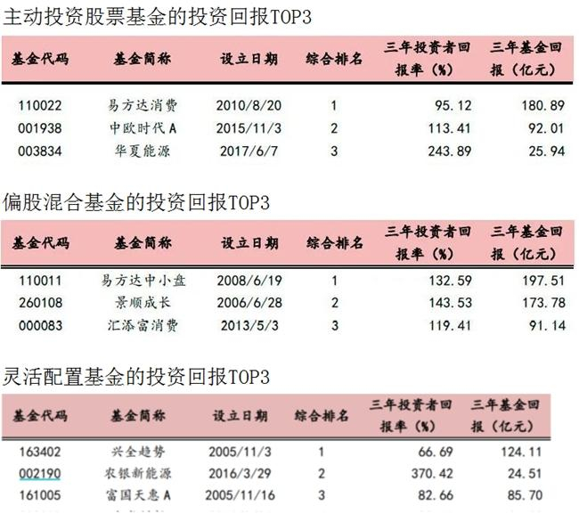 上海证券最新报告《上证基金投资者回报榜2021》中显示,萧楠、张坤、董承非的三年投资者回报率分别为95.12%、132.59%、66.69%。具体来看,股票基金中,萧楠管理的易方达消费行业(110022.OF)综合排名第一。该基金的三年投资者回报率为95.12%,三年基金回报为180.89亿元;偏股混合型基金中,张坤管理的易方达中小盘(110011.OF)以132.59%的三年投资者回报率、197.51亿元的三年基金回报位居综合排名榜首;灵活配置型基金中,董承非管理的兴全趋势投资(163402.OF)以66.69%的三年投资者回报率、124.11亿元的三年基金回报位居综合排名第一(见下表)。