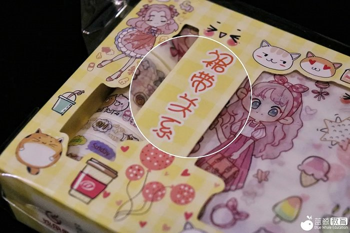 除此之外,这个盲盒中与文具有关的只有一套纸胶带套装以及一张信封贺卡。而纸胶带套装包装上赫然写着“裙带关系”四个字。如此抖机灵地解释这类词语,特别是用在学生文具上,实在有些欠妥。