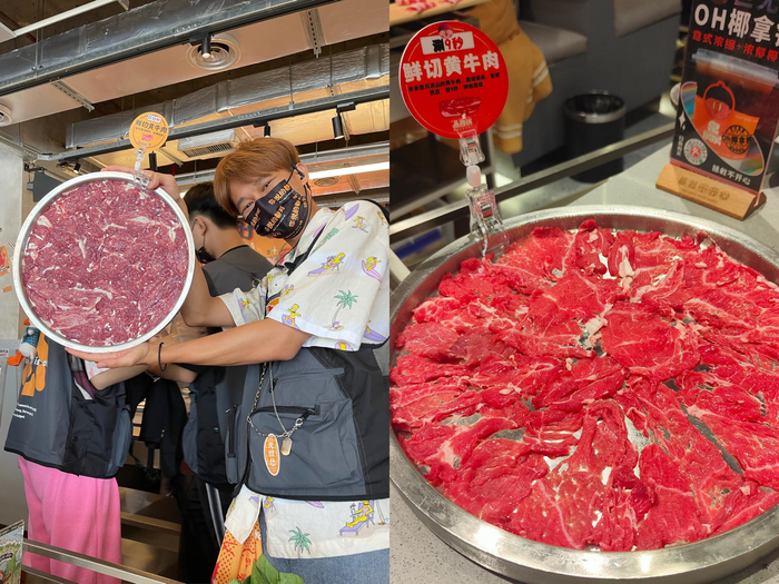 从菜单上看,灥喜锅菜品店内的主打菜品鲜切黄牛肉,以及店内的自助茶水冲泡区,外观上也与怂火锅近似。