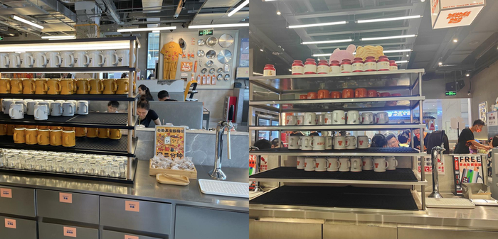 同日晚上,时代周报记者实探灥喜锅杭州银泰门店后发现,其店铺运营模式及物料、标语、装修等,均与怂火锅有相似之处。