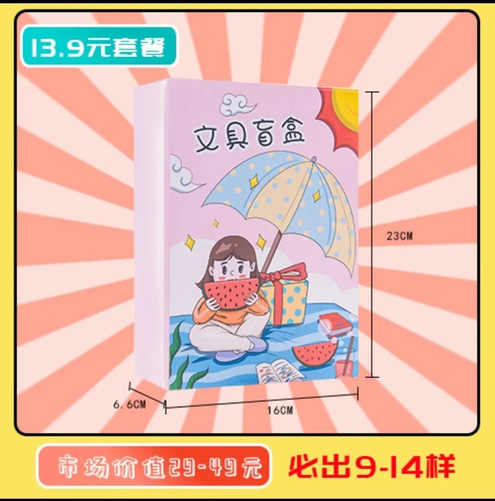 购买于淘宝店铺“文具盲盒十元店”的这款惊喜盲盒,售价为13.9元,卖家在商品选择页明确表示,其市场价值29-49元,必出9-14样。