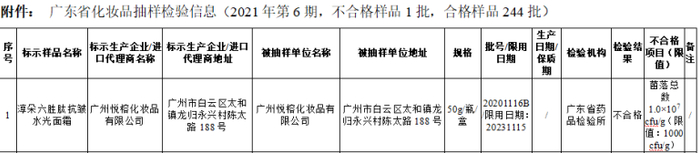 通告显示,根据广东省2021年化妆品监督抽检工作安排,此次涉及全省245批次化妆品的抽样检验信息,经检验合格样品244批次,不合格样品1批次,为广州悦榕化妆品有限公司的淳朵六胜肽抗皱水光面霜,该产品的菌落总数1.0×107 cfu/g(限值:1000 cfu/g)。