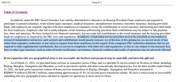 天鹅到家的招股书中还透露,“五险一金”的费用已在财务报表中计提,但未按中国法律法规的要求足额缴纳员工的社会保险和住房公积金。“此外,如果个人服务提供者被归类为我们的雇员,而不是独立的外部人员,这些应计费用和缴款将大大增加。截至本招股说明书发布之日,在这方面,我们尚未接到监管当局任何通知,也未接到相关人员的索赔或要求。如果中国主管部门认定我们需要补缴,认定我们未遵守劳动法律和法规,或认定我们应受到滞纳罚金、罚款或责令及时整改等其他法律制裁,我们的业务、财务状况和经营成果可能受到不利影响”,招股书称。