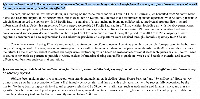 在天鹅到家的招股书中,也详细披露了因为对58同城业务依赖所面临的风险因素,其中包括:若与58集团的合作被终止或缩减,如不再再能够从与58集团的业务合作的协同效应中受益,其业务可能会受到不利影响。