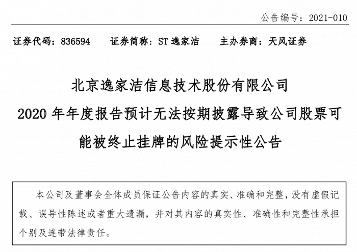 根据逸家洁发布的最新公告称,因业务受疫情影响无法开展,导致公司出现资金紧张,员工大量离职,涉及多起诉讼,有重大债务违约等风险。由于公司存在上述重大事项,公司存在不能持续经营的风险,且存在破产清算的风险。公司没有足够的资金聘请会计师事务所进行审计,无法披露年报,公司股票也存在将被终止挂牌的风险。目前公司也在积极寻找机会开展新业务并寻求融资。