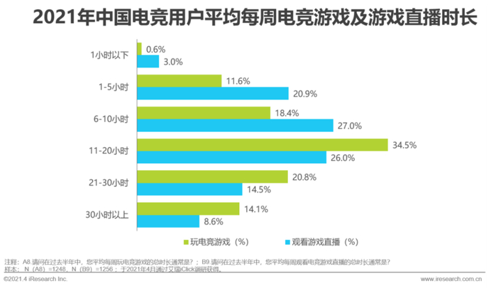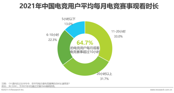 疫情影响下,用户在线娱乐时间的增长,也带动了用户在电竞内容上体验时长的提升。在2021年中国电竞用户中,平均每周玩11~20小时电竞游戏的占比最高,达到34.5%;平均每周观看6~10小时游戏直播的占比最高,达到27.0%。而在电竞赛事的观看上,64.7%的电竞用户平均每月观看超过10小时。