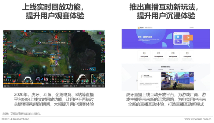 对于用户的电竞互动体验,直播平台通过融合云游戏、带货、游戏宣发等形式,突破原有发弹幕、打赏的互动方式。以虎牙直播为例,2021年3月,虎牙上线一系列直播互动新玩法,包括直播互通游戏、直播间掉宝、直播带货、一键开黑、主播撞车等,持续提升用户的沉浸式直播体验。