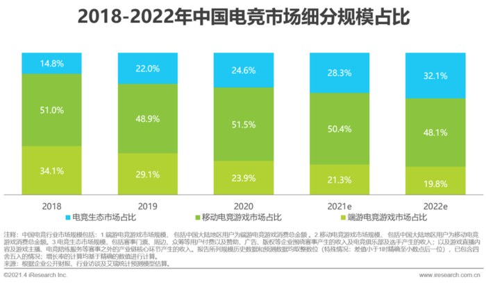 头部电竞游戏及赛事的影响力持续提升和商业化发展进程不断加速,带动了电竞产业链下游的游戏直播、电竞陪练、电竞衍生等业态的快速发展。预计在2021年电竞生态将占据28.3%的电竞市场份额,2021年电竞生态市场中的游戏直播市场规模将超过240亿元,电竞陪练市场规模将超过140亿元,电竞赛事、俱乐部及相关市场规模将超过120亿元。
