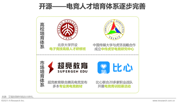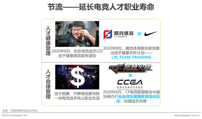 与电竞产业的快速发展不匹配的是,电竞人才仍是十分稀缺的资源。在培育优质电竞人才上,高校培育体系和市场培育体系都是产业链各方合力的成果,两者共同为电竞市场发掘和培养优秀人才。在延长电竞人才职业寿命上,头部的职业电竞赛事联盟如LPL、CF联盟等,通过推出选手健康关怀计划、举办行业自律活动,让更多的电竞选手减轻身体、心理等因素对职业生涯的影响。