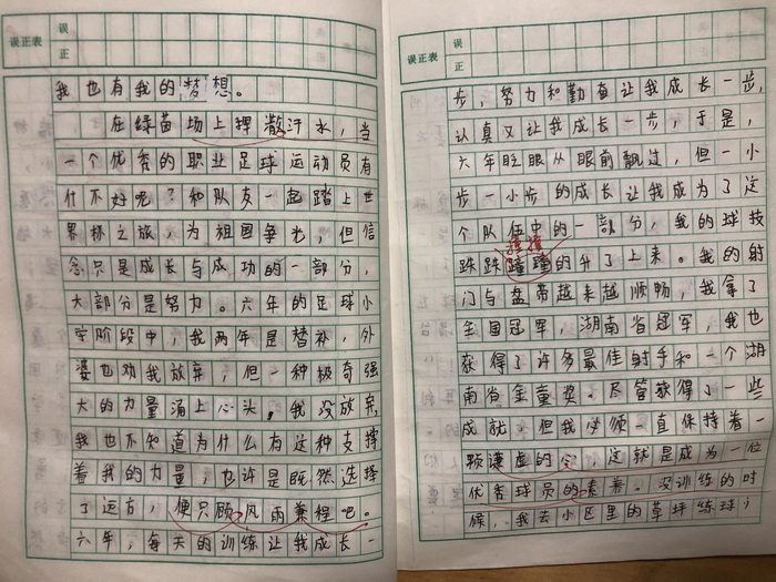 翻开他的作业簿,一篇标题为《梦想》的作文里,常湘科写着“和队友一起踏上世界杯之旅,为祖国争光,但信念只是成长与成功的一部分,大部分是努力……”