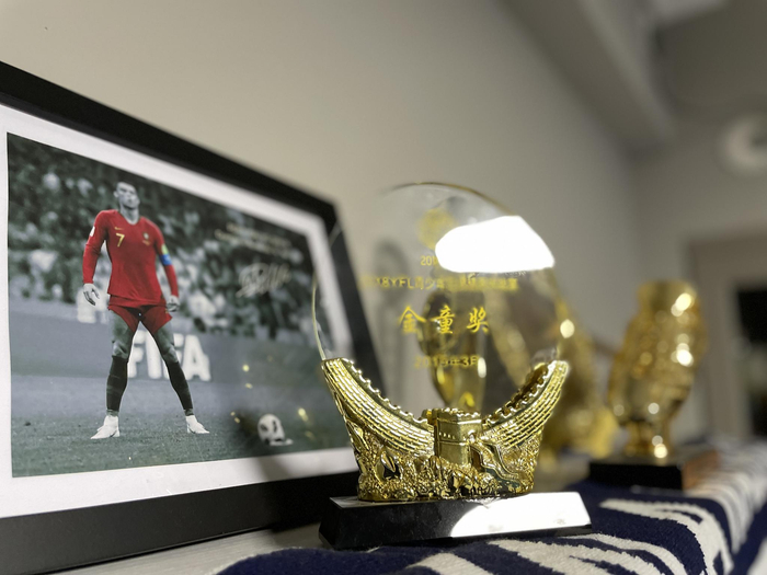 常湘科获得的奖杯和C罗的照片相映成趣。