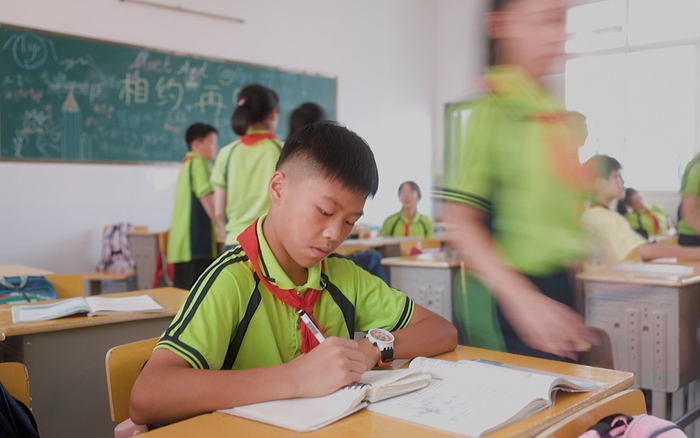 “他在赶作业,这几年都是这样,因为足球训练,回到家后已经挺晚了,为了不落下每天的作业,他把中午和课间休息的时间都利用上了。”