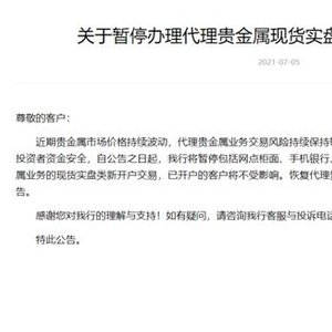 具体来看,北京银行将于2021年7月16日收盘清算时起,暂停受理代理个人客户贵金属现货延期合约新开仓委托申报、暂停受理现货实盘合约买入委托申报。平仓现货延期合约、卖出现货实盘合约以及委托申报提货不受影响。