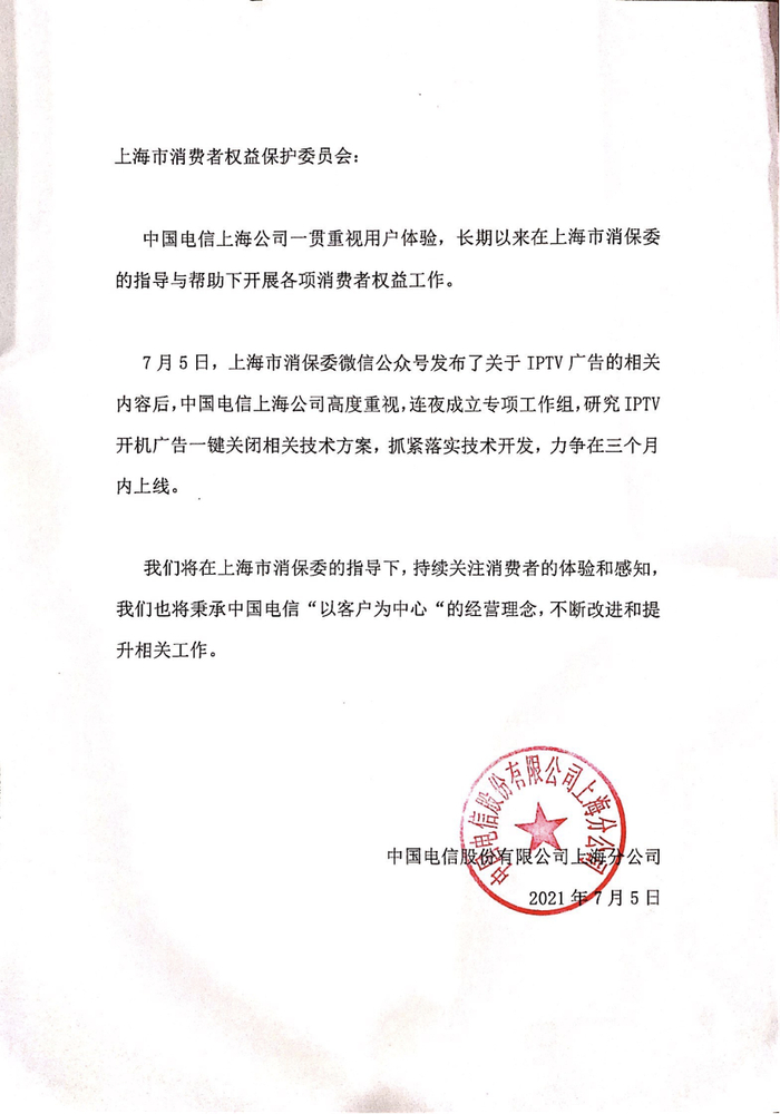 这一事件引发广泛关注后,中国电信上海公司随后回应态度大转变,称公司一贯重视用户体验,上海市消保委微信公众号发布了关于IPTV广告的相关内容后,中国电信上海公司高度重视,连夜成立专项工作组,研究IPTV开机广告一键关闭相关技术方案,抓紧落实技术开发,力争在三个月内上线。