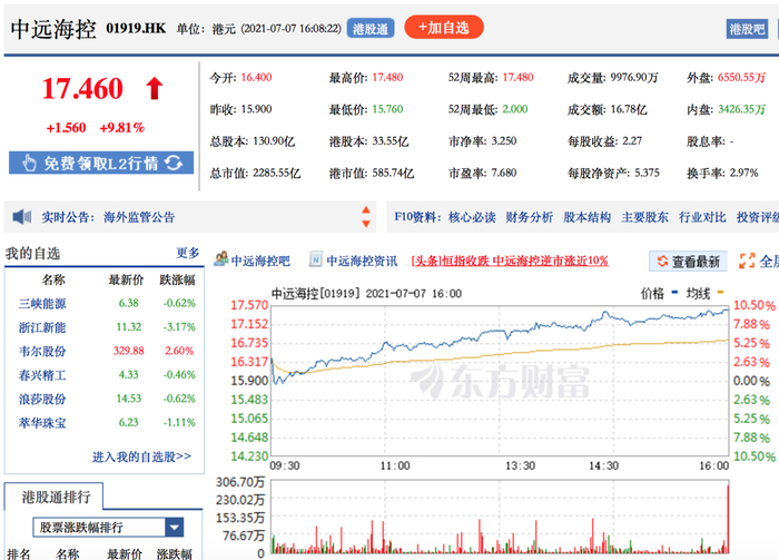 7月7日,中远海控也获得了资金追捧。中远海控A股上涨5.37%至32.6元/股,期间还创出33.4元/股的阶段新高。此外,中远海控H股今日大涨9.81%,并带动了整个港股港口运输板块。