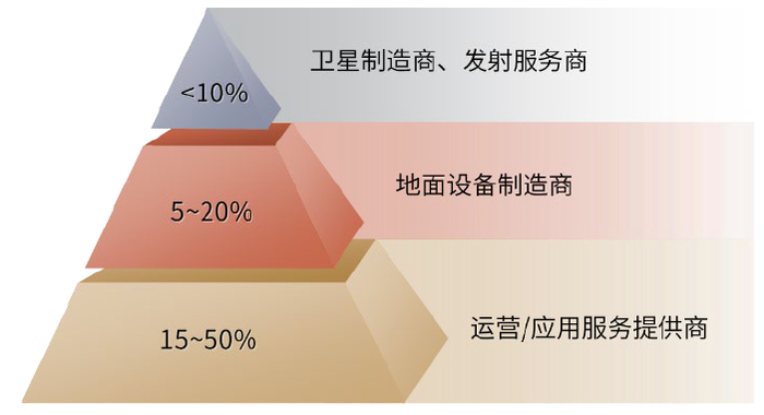 应用服务是产业链上市场规模大、盈利能力更强的环节。根据美国卫星工业协会(Satellite Industry Association,SIA)2020年发布的《2020年全球卫星产业报告》,2019年全球卫星产业产值为2707亿美元,其中应用服务以及与应用服务密切相关的地面设备分别占行业总产值45%和48%,上游卫星制造与发射服务占7%。从盈利能力的角度看,卫星制造环节净利润率通常低于10%,中下游运营/应用服务提供环节的净利润率在15%~50%之间,是产业链上盈利能力更强的环节。