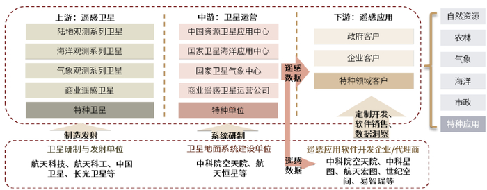 ► 中游:卫星运营环节,包括地面应用系统建设和卫星运行管理的参与单位,包括卫星运控中心、数据接收站的设计与建设,以及各类卫星运营公司;