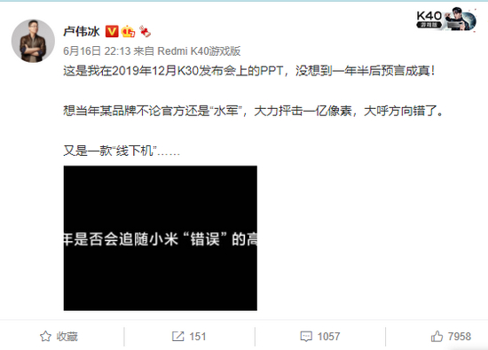 6月16日,荣耀50系列发布当天,小米集团副总裁卢伟冰还在微博上隔空喊话“线下机”,暗指其以低配高价的形象示人。