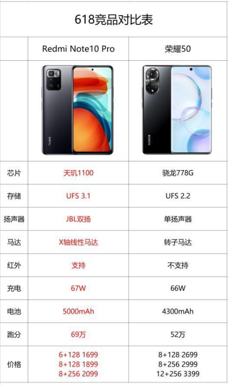 在这几项关键参数上,Redmi Note10 Pro的性能是优于荣耀50一截,价格却低上不少。