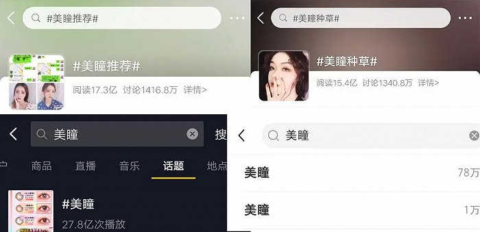 在微博上#美瞳推荐#、#美瞳种草#的话题阅读分别高达17.3亿、15.4亿,都印上#美瞳话题播放量次高达27.8亿,而在小红书上以“美瞳”为关键词进行搜索发现,相关笔记达78万+篇。