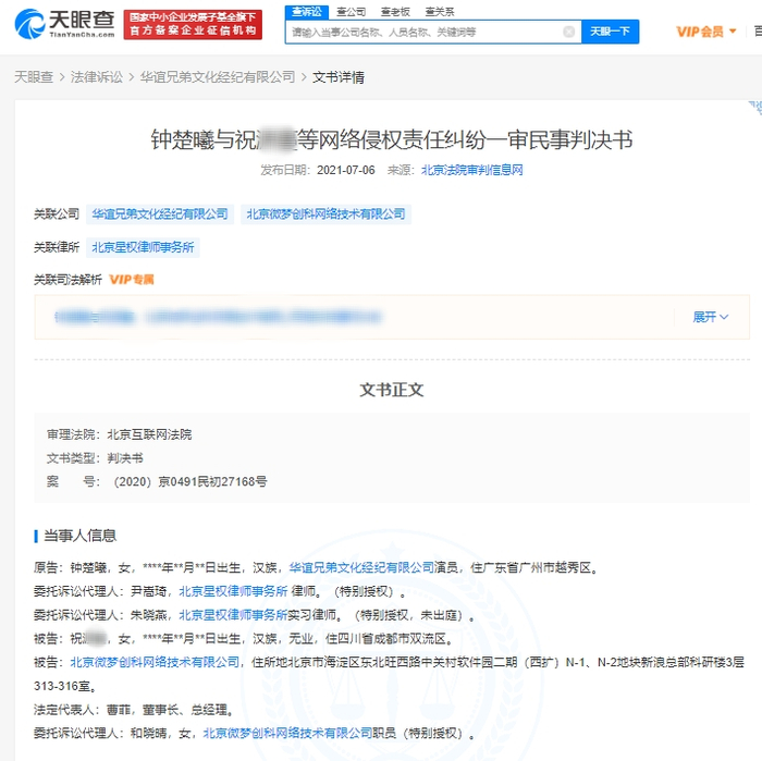 据天眼查APP显示,7月6日,钟楚曦与祝某等网络侵权责任纠纷一审民事判决书公开,案号为(2020)京0491民初27168号,审理法院为北京互联网法院。