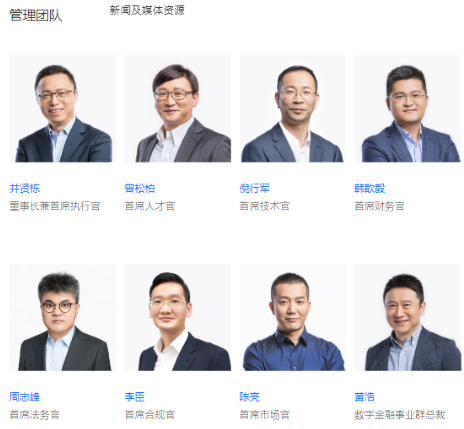 目前,蚂蚁集团管理团队共有15人,包括董事长兼首席执行官井贤栋、首席人才官曾松柏、首席技术官倪兴军、首席财务官韩歆毅、首席法务官周志峰、首席合规官李臣、首席市场官陈亮、数字金融事业群总裁黄浩、国际事业群总裁赵颖、智能科技事业群总裁蒋国飞、社会公益与绿色发展事业群总裁彭翼捷、副总裁(战略投资部)纪纲、副总裁(战略发展部)尹铭、副总裁(大安全事业群)赵闻飙、客户权益保障部总经理丁翌。